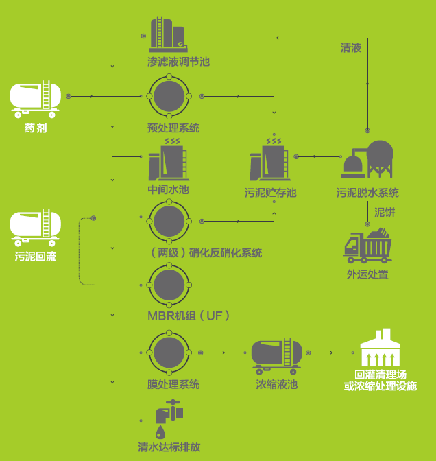 调节池渗滤液先进入预处理系统,去除渗滤波中悬浮物、胶体等污染物后,进入两级DTRO膜处理系统。通过DTRO系统处理后,产水达到排放标准直接外排,预处理产生的污泥经过污泥脱水系统处理后,分离的清液回到渗滤液调节池,泥饼外运处置,浓缩波回灌至填埋场。